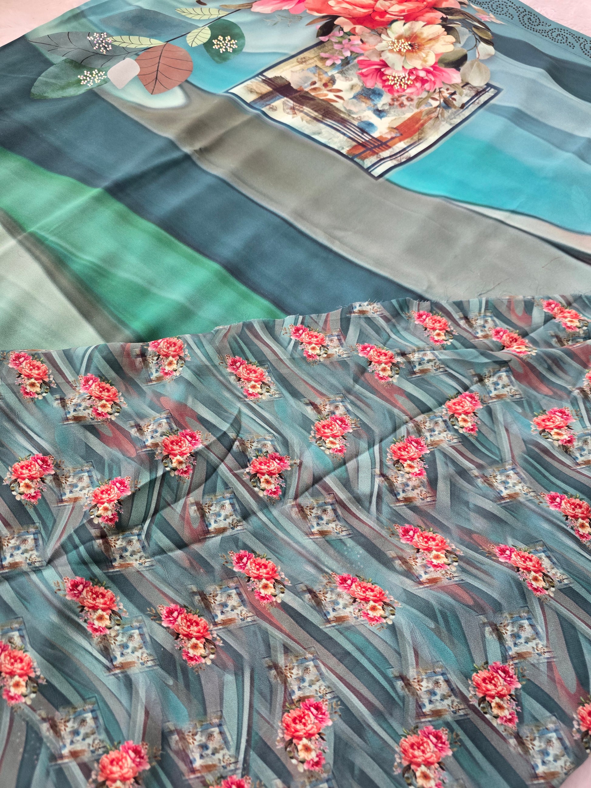 Multi-Color Floral Print Chiffon Saree with Stone-Embellished Border