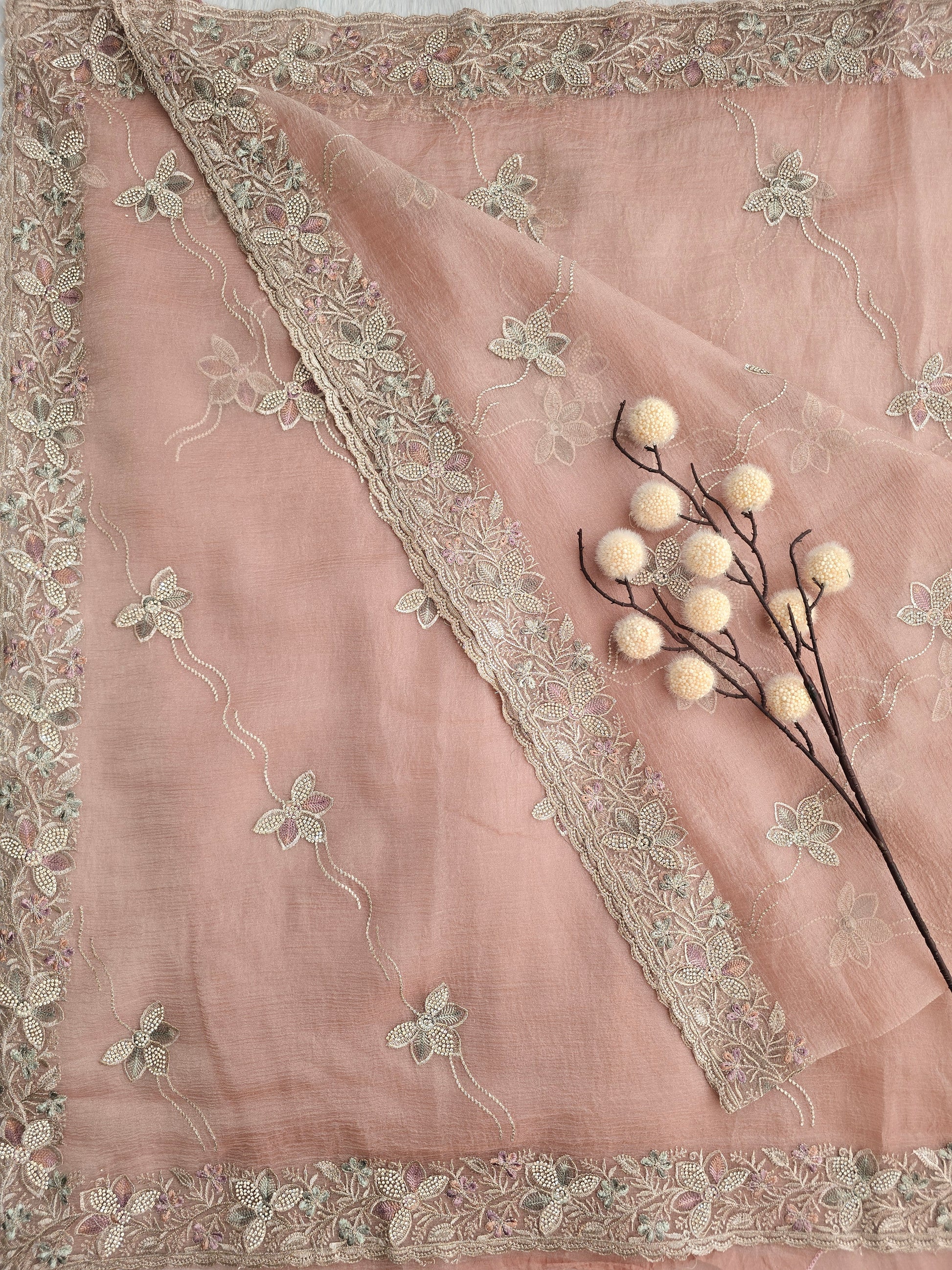 Peach Chiffon-Organza Saree with Intricate Floral Beadwork