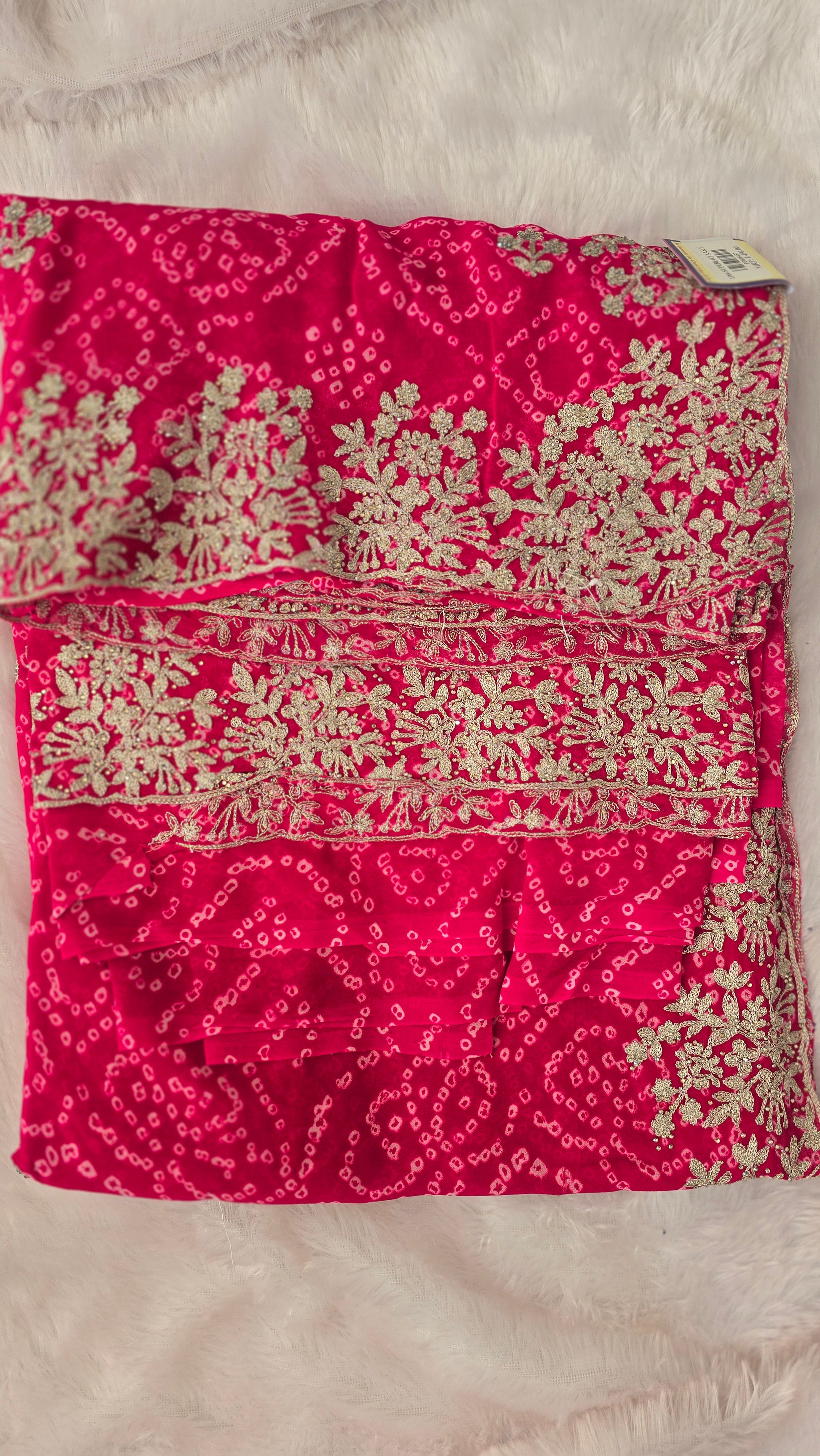 Pink Bandhej Saree with Heavy Golden Floral Embroidery Border