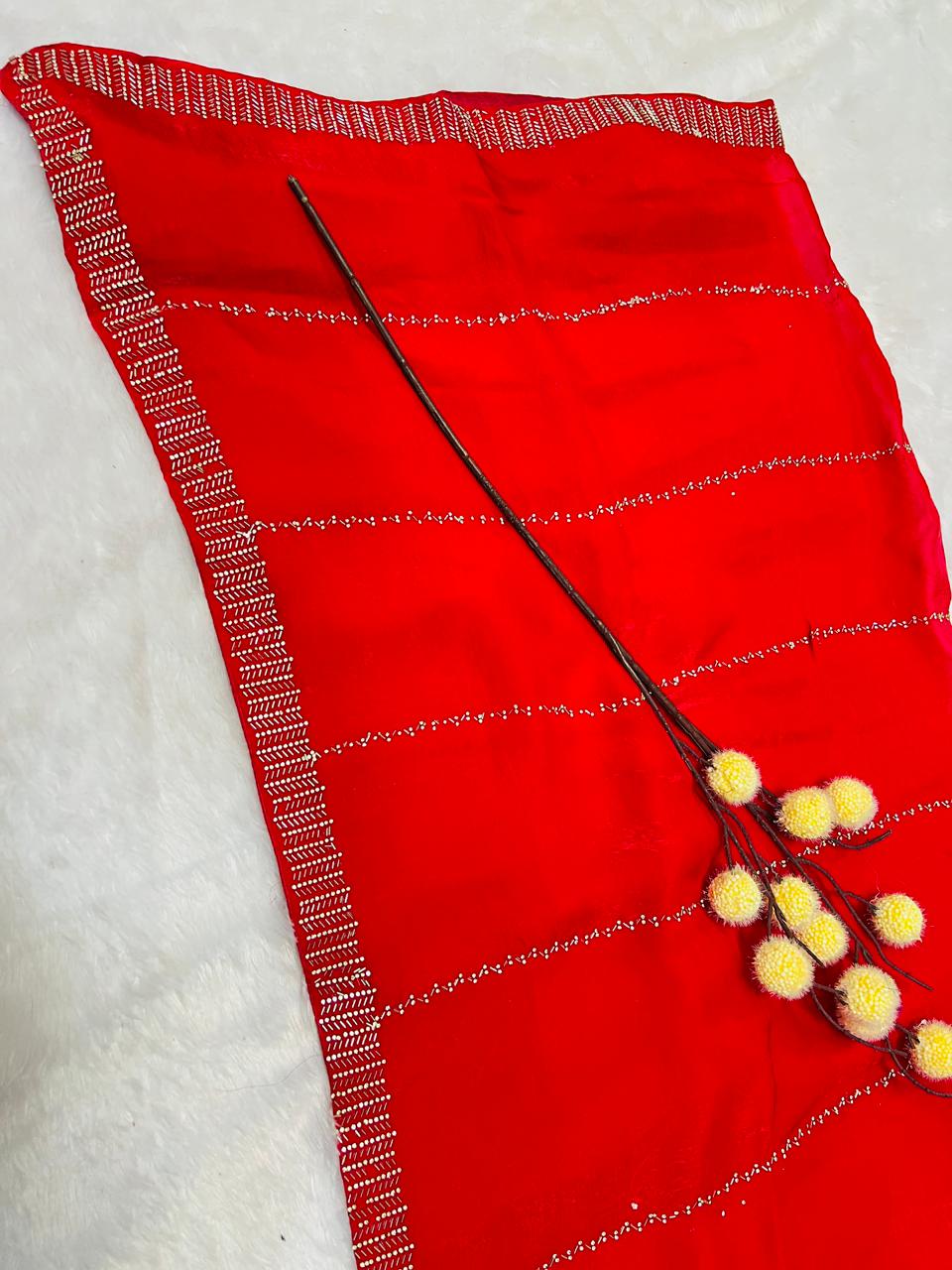 Red Silk Saree with Minimal Sequence Stripe Work